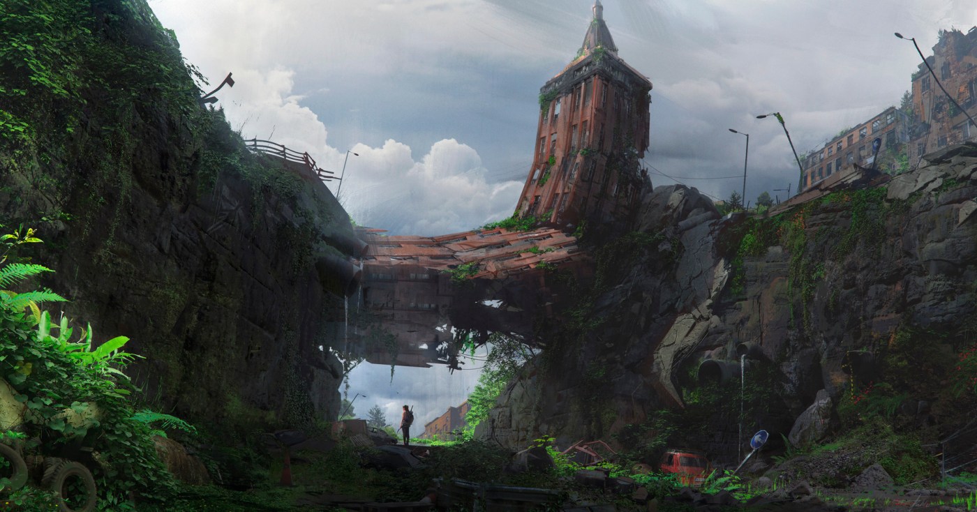 Nothing was behind me, but I noticed something up in front of me. Not too far from the car was a makeshift bridge made from the wreckage of a toppled, brick building. It was some kind of brick tower that had fallen over and smashed into the opposite wall forming a type of unstable bridge. I wouldn’t trust walking on it, but it looked like it was just stable enough to serve as a temporary shelter. I could hide in this riverbed or I could seek out some other place to stay. Many empty brick buildings around.